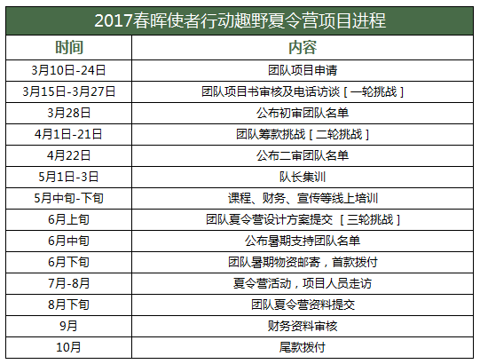 2017年春晖使者行动趣野夏令营项目面向全国招募60-80支高校志愿者团队,走进乡村,开展趣味夏令营。
