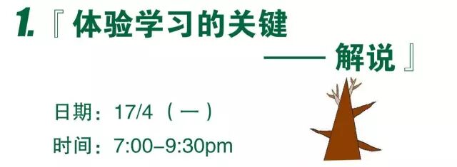 这次讲座将介绍解说的定义、解说在体验学习循环的角色、影响解说的因素、4F的解说技巧、及创意解说的工具。