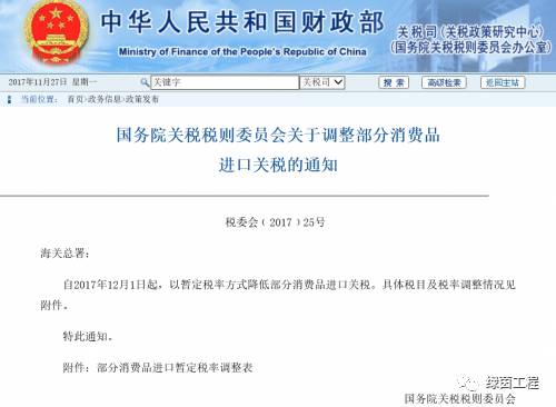 524财政部近日发布的《国务院关税税则委员会关于调整部分消费品进口关税的通知》称,自12月1日起,以暂定税率方式降低部分消费品进口关税,范围涵盖食品、保健品、药品、日化用品、衣着鞋帽、家用设备、文化娱乐、日杂百货等各类消费品,共涉及187个8位税号,平均税率由17.3%降至7.7%。其中,电动牙刷、婴孩车的进口关税分别从30%、20%调整为10%;婴儿尿布及尿裤的进口关税从7.5%下调为0。