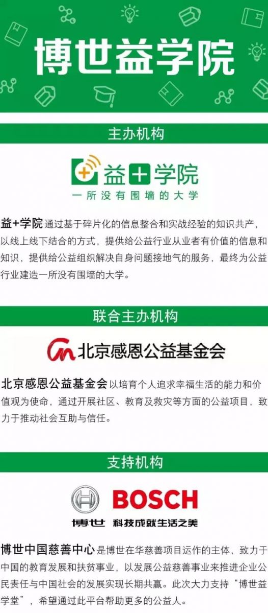 课程结束后,表现优秀的学员将获得与学费等额的奖学金,并获得「公益人职业生涯规划系列课程之专业技能工作坊」的优先录取资格和学费优惠资格哦~