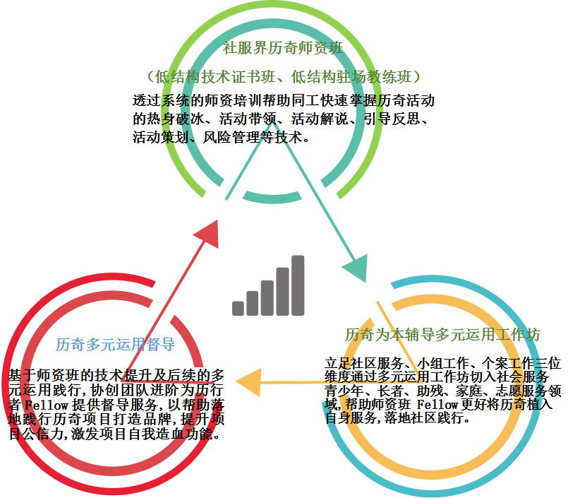 历,历奇为本辅导、经历体验;行,实践、行动、前行;历行者意为历奇为本辅导实践的先行者、践行者。期望透过“历行者”计划集结有志于践行历奇为本辅导多元运用的社会服务工作者,与协创携手推动历奇为本辅导在社会服务的个案辅导、小组工作、社区互助、志愿者团队打造与管理等工作领域的综合运用。