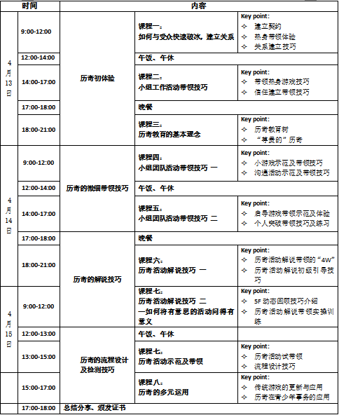 1.借助有针对性设计的历奇体验活动,帮助参加者初步了解国内外各类最新历奇活动,通过运用各种设施、器材开展高素质的历奇实践,掌握历奇为本辅导的热身破冰、关系建立、团队打造、活动带领、活动解说、活动策划、风险管理等技巧。