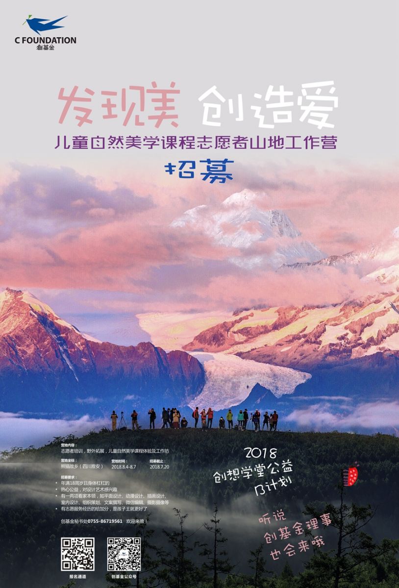 8月,创基金将携手志愿者踏上世界上发现第一大熊猫的地方,也是创基金儿童自然美学课程的试点——雅安,走进自然,开展“2018创想学堂公益B计划”-儿童自然美学课程山地工作营。在自然中,一起为儿童自然美学课件而共创,让儿童自然美学课程从试点走向全国。