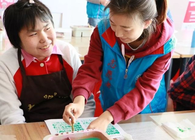 “帮憨福儿找回勇敢的心”公益项目采用社工小组工作方法,让成功就业并表现优秀的憨福儿与本次项目受助对象组成“朋辈技能成长小组”。学长学姐们用彼此容易理解的方式传授经验,更重要是用榜样的力量影响着大家更加努力地学习和训练。瞧,正在为学弟们辅导的小姐姐宁宁,正一脸自信地拿起画笔耐心示范,俨然是一个小老师了。