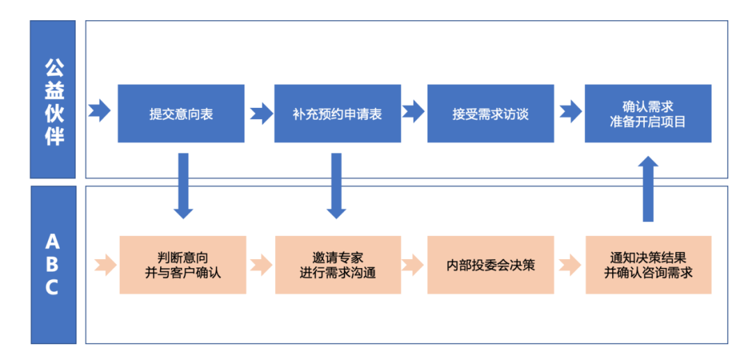 第一阶段:意向确认。您提交咨询意向表,ABC 进行内部判断,并进行意向沟通;