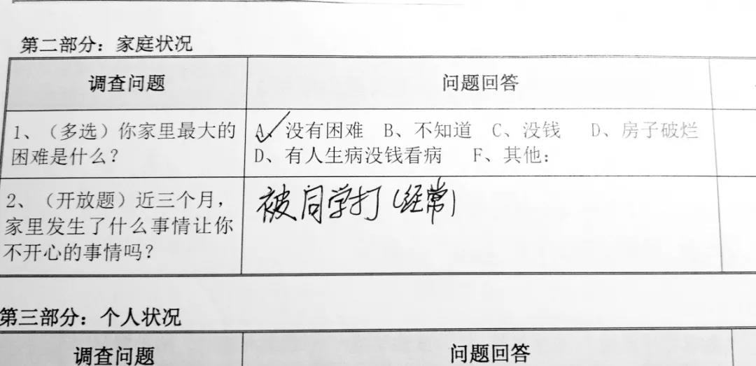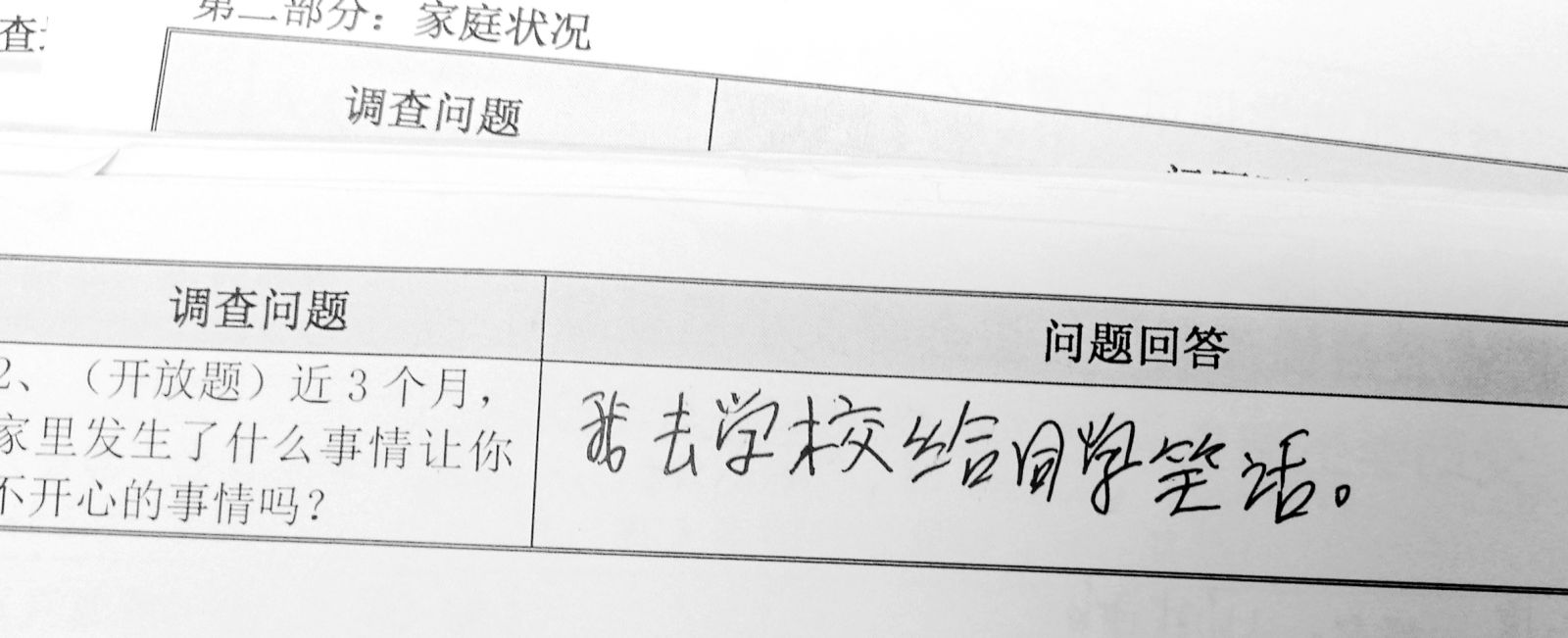 在问卷中,志愿者注意到部分孩子遭遇了一定的校园欺凌,出现诸如“经常被打”“被同学们嘲笑”等字眼。