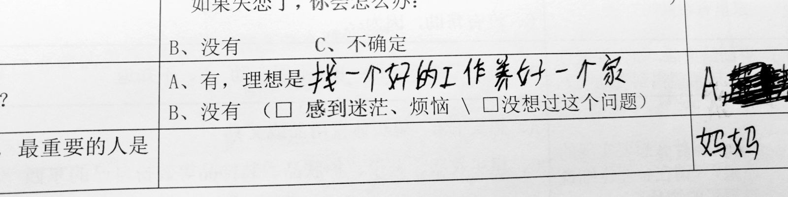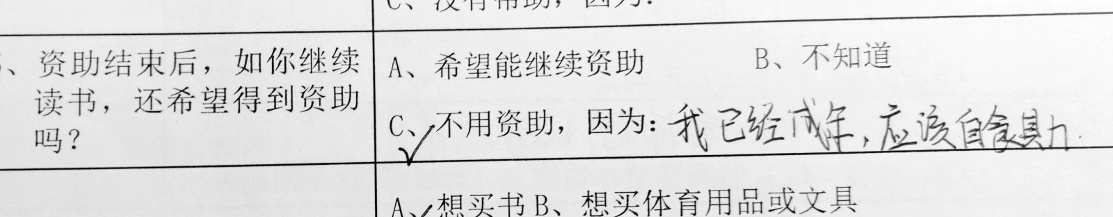 在是否需要继续资助这个问题上,年幼的孩子大都表示不清楚,年纪稍大的则很清楚地表达“希望继续资助”,而下面这位在读高三生却留下这句话: