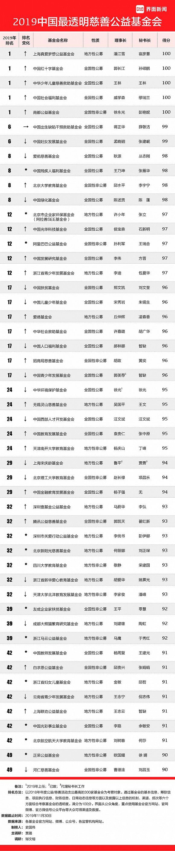 据悉界面新闻以2018年度公益/慈善活动支出最高的300家慈善公益基金会(最有支付能力的前300家基金会)作为候选。从基本信息披露、筹款信息披露、项目执行信息披露、财务信息披露、日常披露、披露渠道/频次等多角度衡量,并从公众视角出发,不仅关注其披露内容,也关心官网网站、微博等自有平台的易用性和更新频率,从中选出前50家。