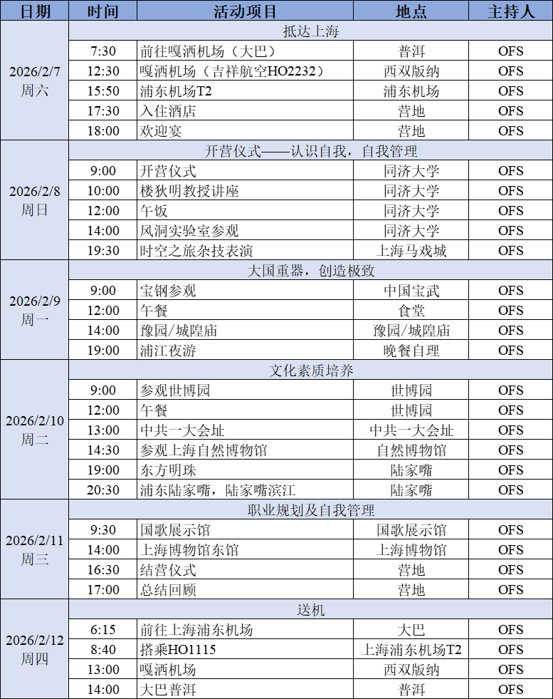 962026年2月7日至12日,一场跨越山海的成长之旅即将启程。来自云南宁洱县、江城县、镇沅县的45名优秀高中生,将奔赴上海,参与由成英公益基金会主办的“走近大国重器,优秀师生研学——2026云南普洱三县OFS桃李天冬令营”,在6天的沉浸式体验中,解锁世界的更多可能。